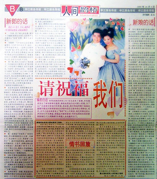 编者的话:秋风送爽的时刻,040先生送来了喜糖,并向编者发出了参加婚宴的邀请,编者由衷地为这对新人祝福。为了让广大读者分享他们的幸福,在这里,我们特地用整个版面的篇幅刊载这对新郎新娘在征婚和应征过程中的心得体会。或许,对于已经或将要登上“鹊桥”的人们来说,他们所表达的心声对你们不无裨益。祝福这对新郎新娘!同时也预祝未来的新郎新娘们!《人间鹊桥》为有情人永远敞开大门。