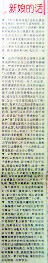 《申江服务导报》是我在偶然间发现的一份内容丰富的报纸,而通过这份报纸的“人间鹊桥”顺顺利利地找到自己的情感归属,真的可以说是连我自己都不敢相信的事情。但在新家宽敞的厨房里为辛苦了一天的老公准备晚饭时的那份为人妻的充实感又在明确地告诉我,我是真的和040先生在一起了。